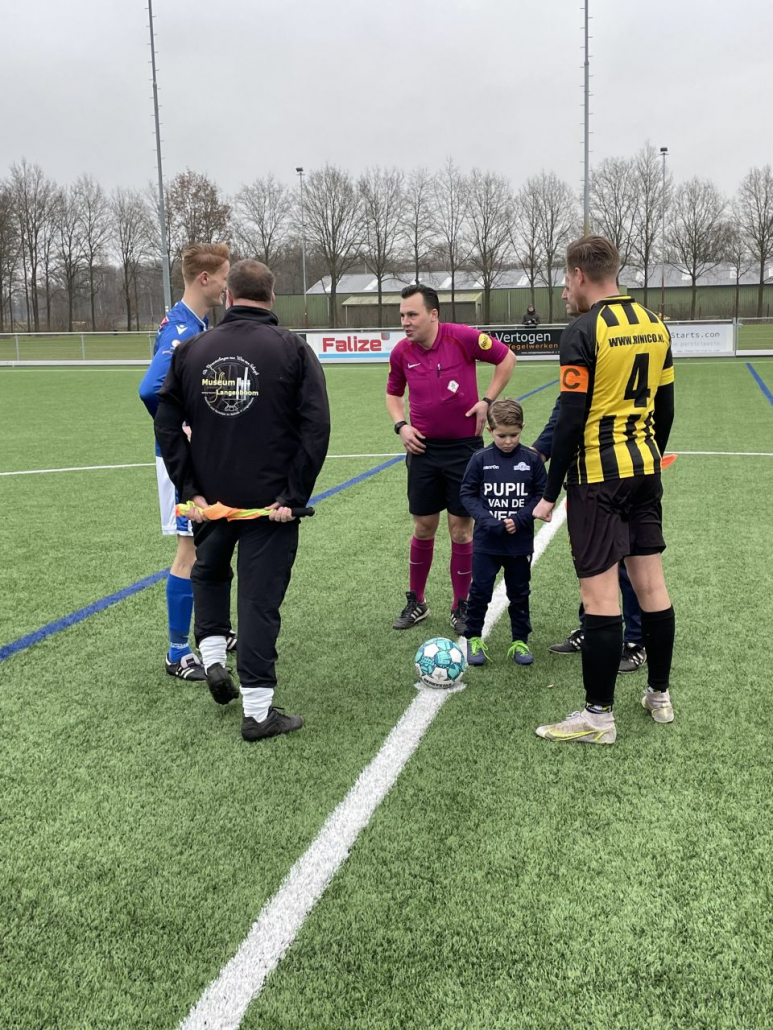 Na de actie voorafgaand aan de wedstrijd van de Pupil van de Week: Tijl Fleuren, fluit de scheidsrechter om 14:30 uur en start de wedstrijd.