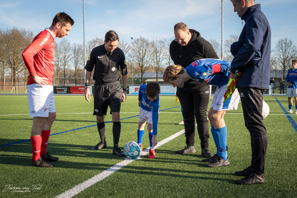 Na de warming up ging ik nog even mee naar de kleedkamer en mochten we naar het veld. Ik mocht voorop het rijtje spelers van Festilent het veld op. Ik kreeg de bal van de scheidsrechter en mocht m op de stip leggen. Ook mocht ik de toss doen. En daarna de aftrap waarbij ik allemaal spelers van Venhorst uitspeelde en scoorde bij hun keeper! Daarom kreeg ik een prachtige bal met alle namen van de spelers van het eerste. Toen ging ik naar de dug-out en ging de scheidsrechter fluiten. Dat ging kei hard, ik werd bijna doof van die fluit. Toen kreeg ik van een speler van Festilent een zakje snoep en de eerste helft eindigde in 0-0.