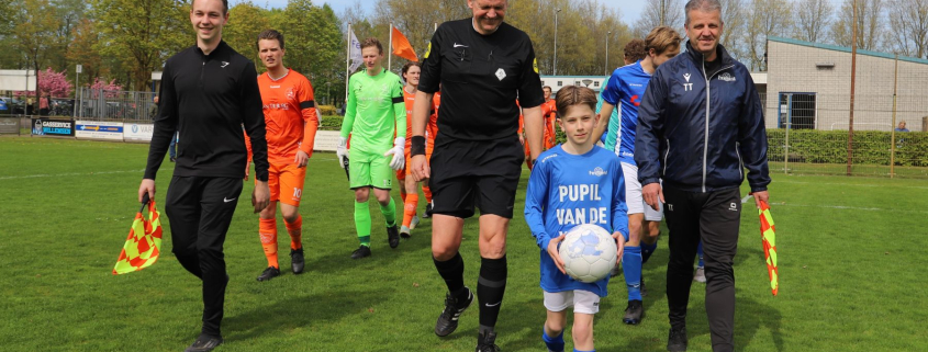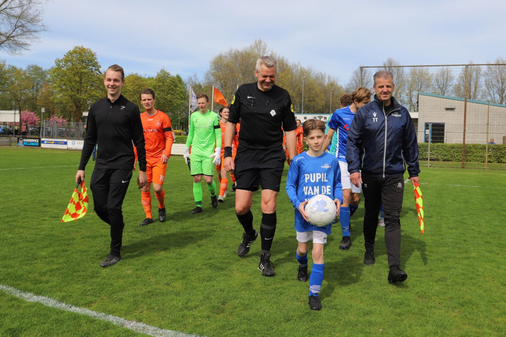 Na de warming-up mocht ik mee naar de kleedkamer voor de bespreking waarna we met z’n allen naar het veld liepen. Daar aangekomen mocht ik met de wedstrijdbal voorop naar de middenstip lopen.